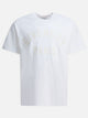 "Givenchy Paris" Givenchy T-shirt in cotton with a linear structure, constructed outerwear with short sleeves. The crew neck features a riveted workmanship, while the front houses the Givenchy Paris grosgrain appliqué, attached by embroidered zig-zag stitching, which defines a structural detail on the surface. The silhouette is regular, with no additional decorative elements, keeping the construction focused on material essentiality and workmanship of the inserts.