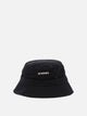 Jacquemus "Gadjo" bucket hat made of cotton with compact texture and soft structure. The construction features a rounded dome and flexible brim finished with prominent topstitching along the edge. The design incorporates an adjustable drawstring with visible topstitching, to be tied at the back, which helps define the functional silhouette. Distinctive silver metal logo detail applied to the side.