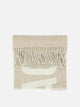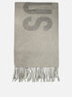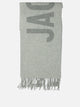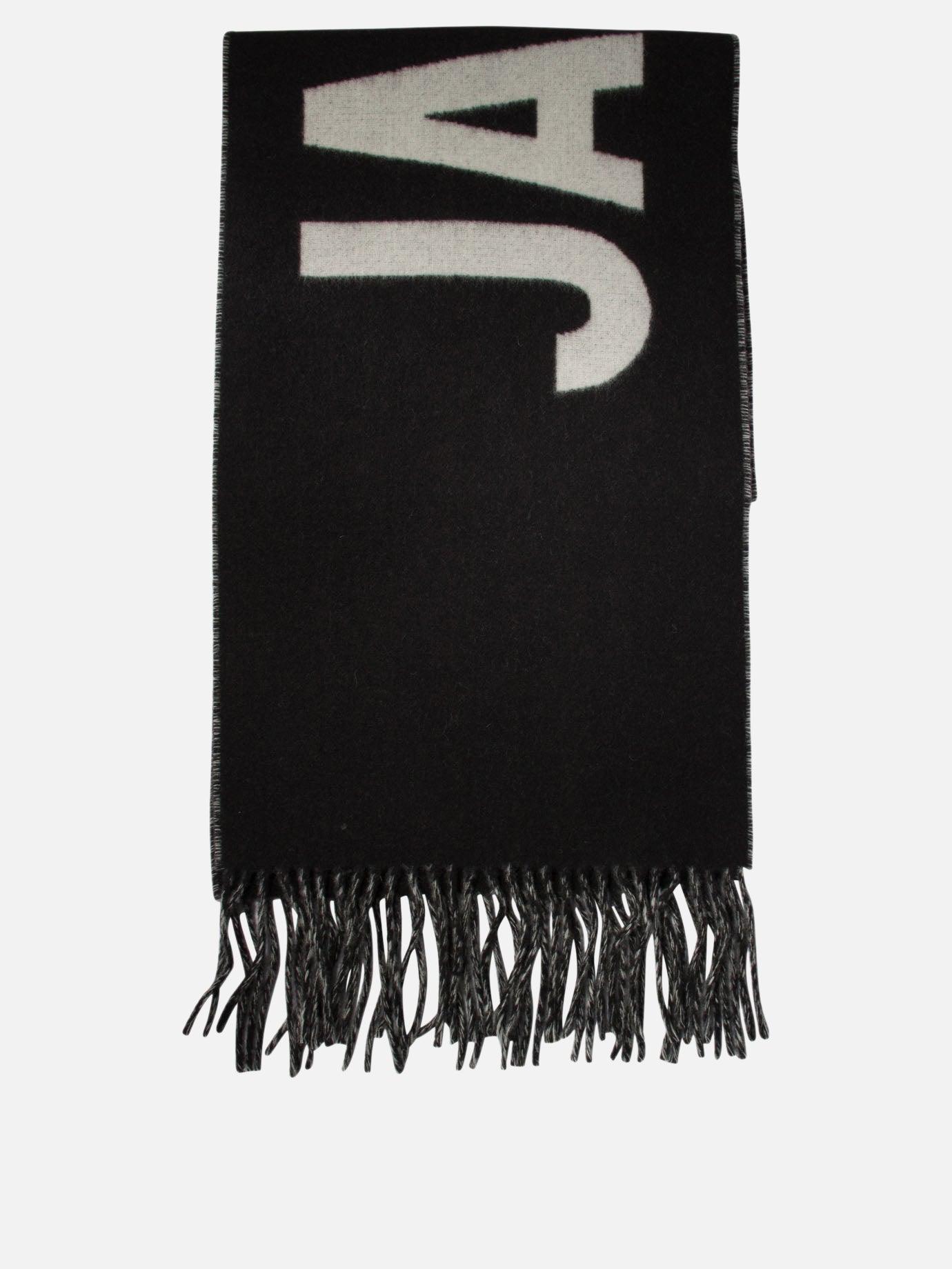 Jacquemus "L'Echarpe" scarf, made of plain-spun wool, features a soft texture and a linear rectangular silhouette. The Jacquemus logo is worked in jacquard within the weave, contributing to the textured look of the fabric. 12 cm bangs are applied on both ends, characterizing the finish. The construction results in no visible seams, maintaining a clean edge on both long sides.