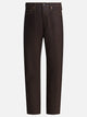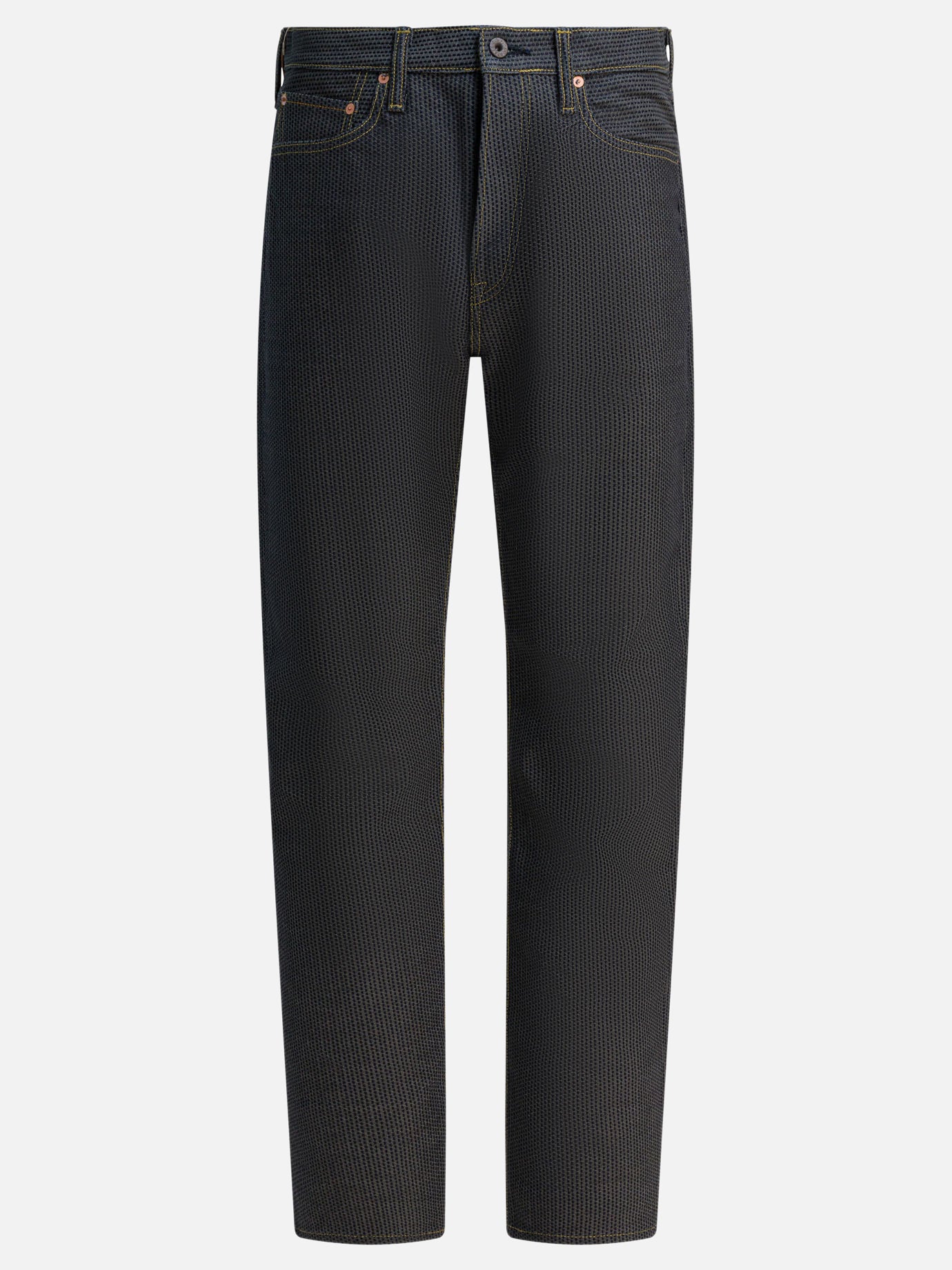 Kapital "Monkey Cisco" jeans, made of Kakishibu-dyed denim and featuring a Sashiko Indigo pattern integrated into the fabric structure. The model features a five-pocket construction, front button closure and adjustable belt with buckle applique at the back. The silhouette follows slightly soft lines, with visual and functional details including a woven logo patch and an embossed leather patch on the back.