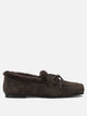 Aeyde "Jasper" loafers made of suede leather with a smooth, even surface. The structure features a square-toe silhouette, hand-stitched details visible along the edges and an appliquéd bow on the upper. The interior is lined with a short-haired shearling lining designed to provide thermal comfort. The compact sole features a linear profile without decorative insertions.