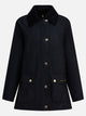 Barbour "Modern Beadnell" jacket constructed of waxed cotton with water-resistant texture. The silhouette features a feminine silhouette with a regular fit, thin ribbed maxi collar and front snap button closure. Two back slits, also with snap buttons, define the back line. Details include bright gold-tone logo snaps, balanced width and visible seams.
