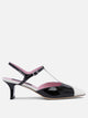 Carel "Isadora 40mm" sandals with uppers made of patent leather, salome structure with contrasting cut-out details. The handcrafted full-grain leather construction is complemented with a leather sole and leather lining. The silhouette is distinguished by a slightly flared, sculpted, lacquered spatula heel that offers stability and a marked graphic line.