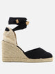 Castañer "Carina 90mm" high espadrilles with an organic cotton upper and tapered silhouette construction. The model features a wedge made of woven jute, a raised midsole and a bow-tie ankle closure. The insole is padded and sewn directly to the base of the shoe. The construction combines textile materials and woven natural fiber, resulting in a defined line and stable structure.