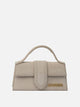 Jacquemus "Le Bambino" handbag made of waterproof nubuck with a rigid structure. The padded top handle is integrated into the compact geometric silhouette. Magnetic flap closure ensures the protection of interior items. Model is fully lined in cotton, with contrasting dyed edges. Functional elements include a detachable long shoulder strap and a back patch pocket, complemented by gold metal trim and logo.