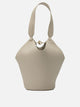 Khaite's "Lotus Mini" handbag, made of grained leather, features a scarf-inspired design and is distinguished by its lightweight construction. The rounded base ensures stability during use, while the compact silhouette promotes an ergonomic hand grip. The inner closure features jeweled frog, a functional element that ensures protection of the contents.