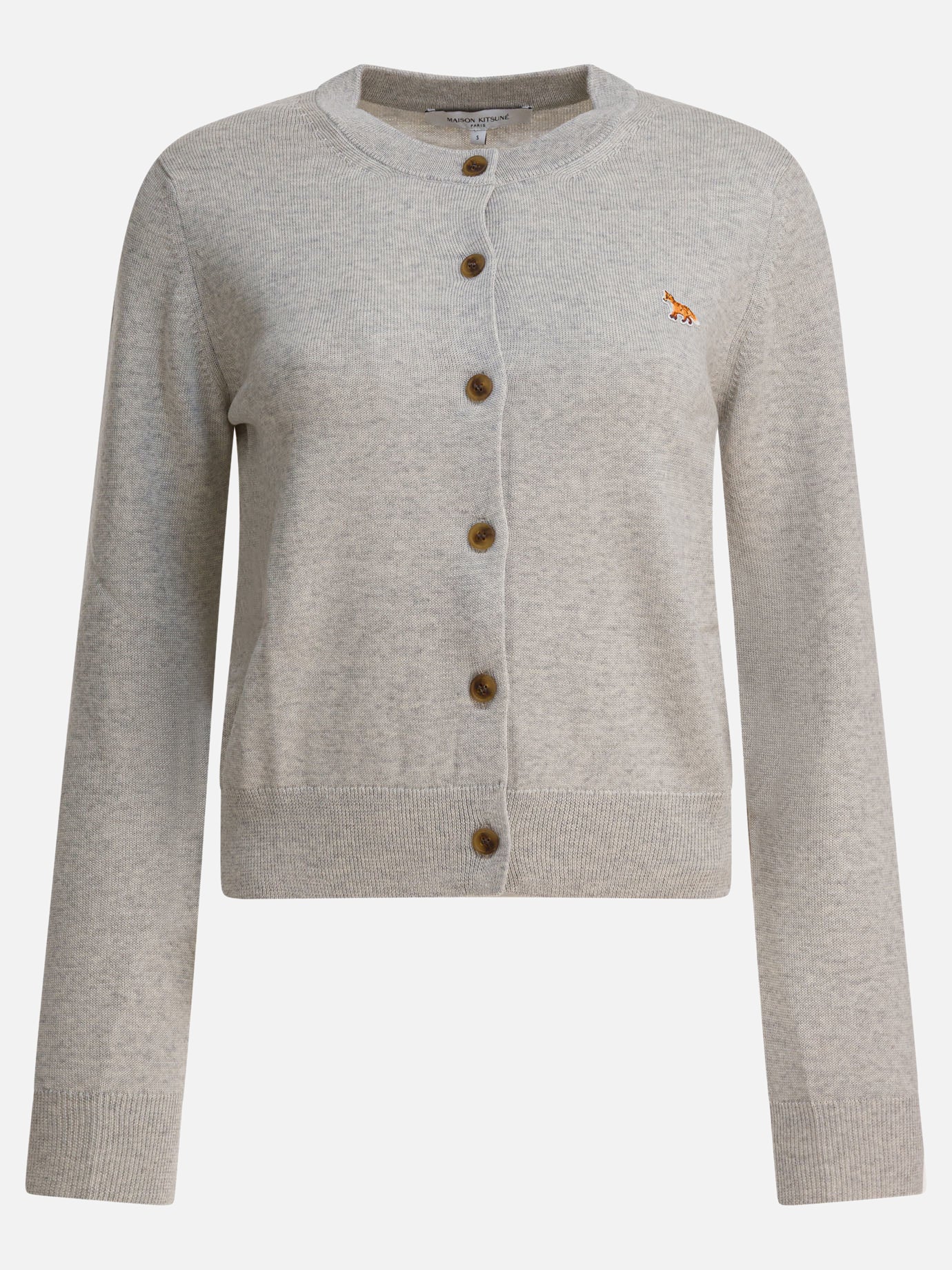 Maison Kitsuné "Baby Fox" cardigan made of extra-fine merino wool. The construction features a straight silhouette with a regular fit, shaved-knit crew neck and long sleeves. The front closure is completed with Maison Kitsuné engraved buttons. Ribbed trim at neckline, cuffs and hem. A Baby Fox embroidered patch, identifying the brand, is applied on the chest.