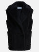 Max Mara alpaca and wool sleeveless teddy jacket made of silk-based fabric with double-breasted construction. The line is wide, with an oversized silhouette and maxi lapel collar. The front closure features two exposed buttons, while large patch pockets on the front increase functionality. The garment is fully lined in stretch fabric with Monogram jacquard pattern.