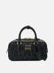 Miu Miu "Arcadie" handbag constructed with matelassé work that defines a three-dimensional surface. Made of leather with rigid structure and bowling bag silhouette. Features leather top handles, adjustable and removable shoulder strap. Exposed metal front lettering logo, metal trim applied on closure and accessories. Top zipper provides closure for the bag. Cotton satin lined interior features interior zippered pocket.