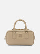 Miu Miu "Arcadie" handbag made of leather with light padding that defines a compact and voluminous structure. The silhouette recalls the classic bowling bag, with two leather handles and a removable and adjustable shoulder strap. Painted metal front lettering logo is integrated as a functional and decorative element, while gold hardware completes the construction. Top zipper closure, support feet and cotton satin interior with zipper pocket.
