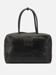 Miu Miu "Beau" handbag, made of smooth, soft leather, constructed with rigid structure and clean profile. Contoured leather handles allow for both hand and shoulder use. The embossed front lettering logo complements the gold metallic hardware, while the closure features a top zipper. The interior, lined in cotton satin, is organized with double zippered pockets.