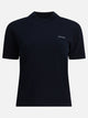 Miu Miu cashmere sweater, constructed from shaved knit with a straight structure and essential silhouette. The model features short sleeves, a ribbed collar and English shoulder that defines the line of the shoulders. The brand's logo is inlaid into the knit, giving it a visible graphic element. Made of long-fiber cashmere, the surface is smooth and uniform with a compact appearance.