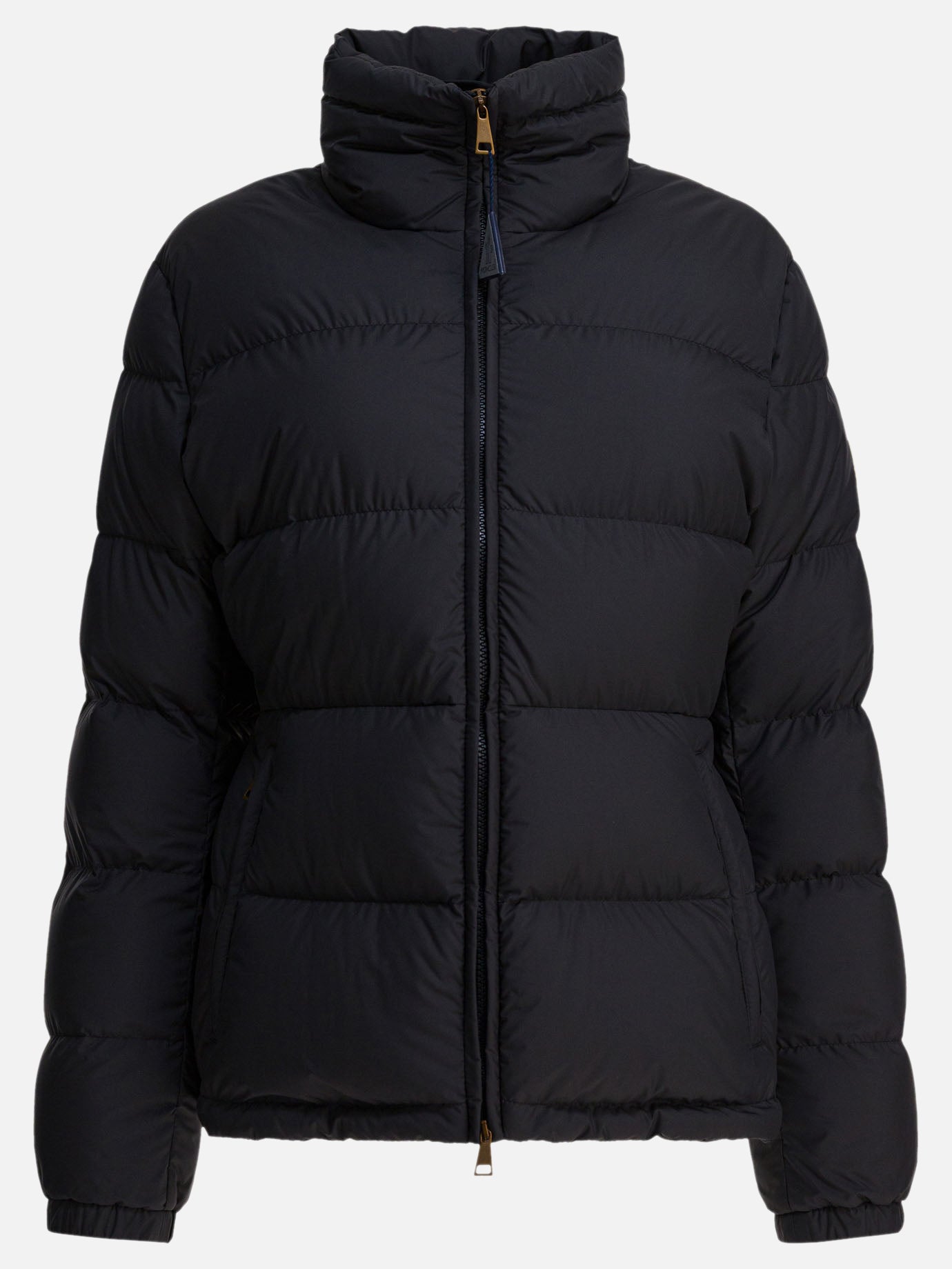 Moncler "Dourbe" short down jacket, made of recycled nylon longue saison. The construction features a defined, short silhouette with horizontal quilting designed to enhance the body line while maintaining lightness and thermal insulation. The construction features full-zip front closure and protective collar. The design is distinguished by an essential layout devoid of additional decorative details, emphasizing the functional aspect and formal cleanliness of the garment.