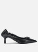 Prada's 55mm suede pump, made of leather with a soft-touch matte surface. The structure features a tapered silhouette with a pointed toe closure and heel fitted with a ruched elastic insert. The hourglass heel provides walking stability. The front element integrates a triangular logo with gold lettering applied on the toe. The upper is compact and free of visible seams.