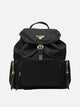 Prada Re-Nylon casual backpack with lightweight construction and compact structure. The main body is made of Re-Nylon, while the details are Saffiano leather. The top opening is adjusted by drawstring, flap with magnet and buckle closures. The silhouette includes a front pocket and a side pocket both with zippers. The shoulder strap and handles are adjustable braided ribbon. Re-Nylon inner lining with two pockets.