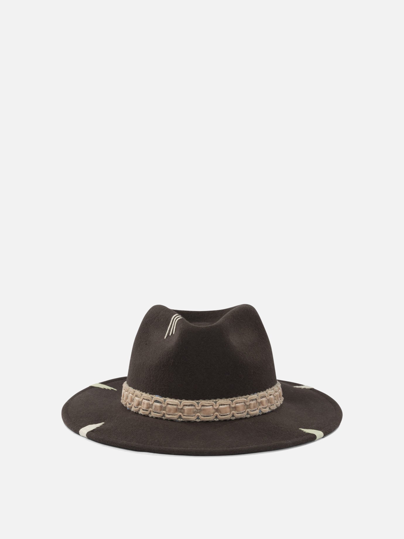 "Over The Moon" The Hat Gang hat, made of wool and featuring a textured construction. The surface hosts an embroidered "Over The Moon" inscription and hand-executed decorative motifs, visible on the panel, that follow the traditional silhouette of the pattern. The sharp, contoured edge offers stability, while the compact weave provides solidity to the form. Embroidered elements create reliefs perceptible to the touch.