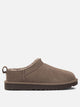 Ugg "Classic Micro" ankle boots, constructed with a genuine suede upper lined internally with dual-density sheepskin. The structure is defined by a low, compact profile, with a fabric trim made from recycled polyester fibers. The lightweight sugarcane EVA sole balances lightness and support, while the rear pullback allows for a functional fit. A leather label with embossed logo completes the design.